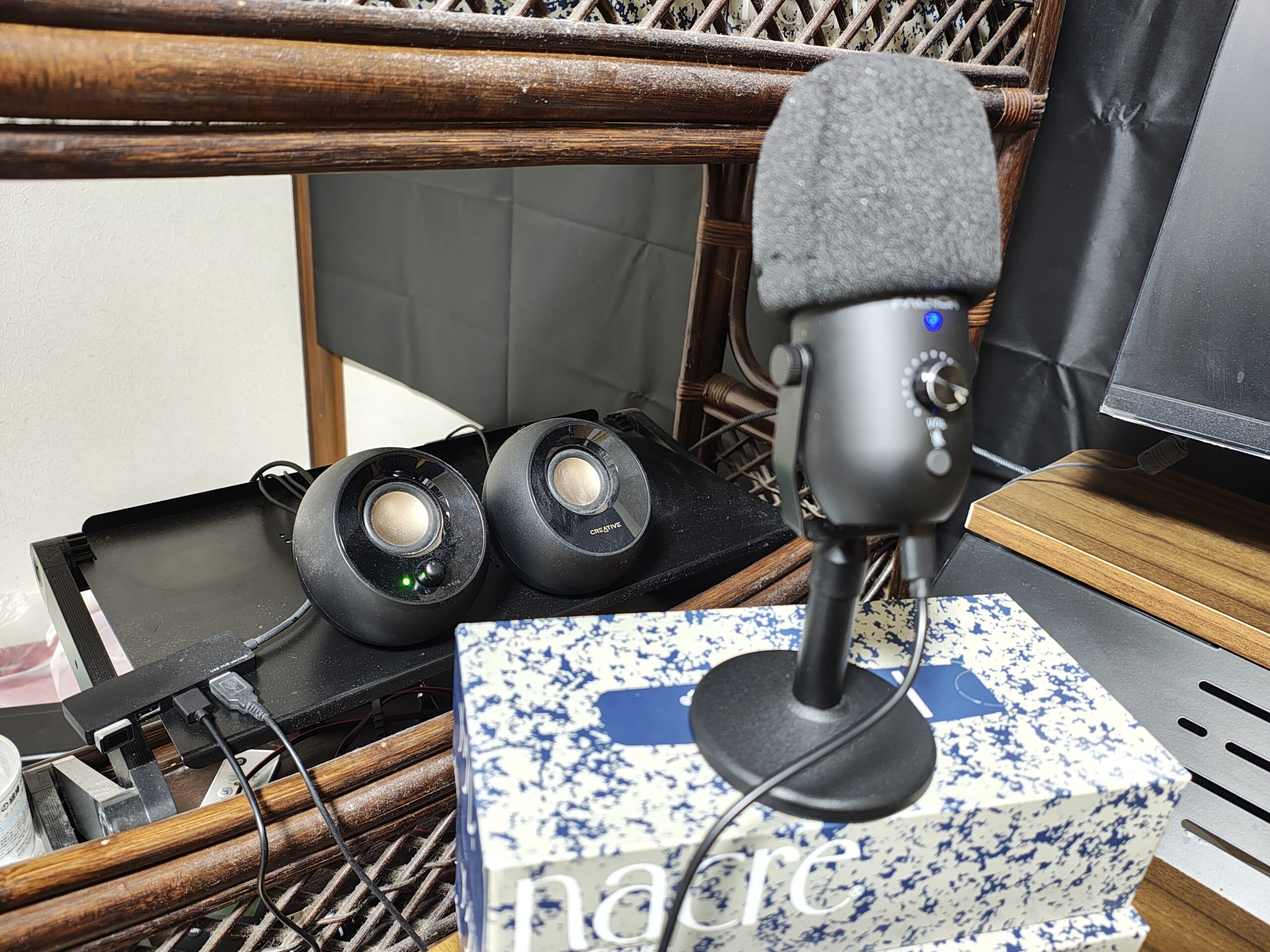 そのままデスクに置くと位置が低すぎるため、ティッシュの箱を2つ重ねて、その上にマイクスタンドを設置している。